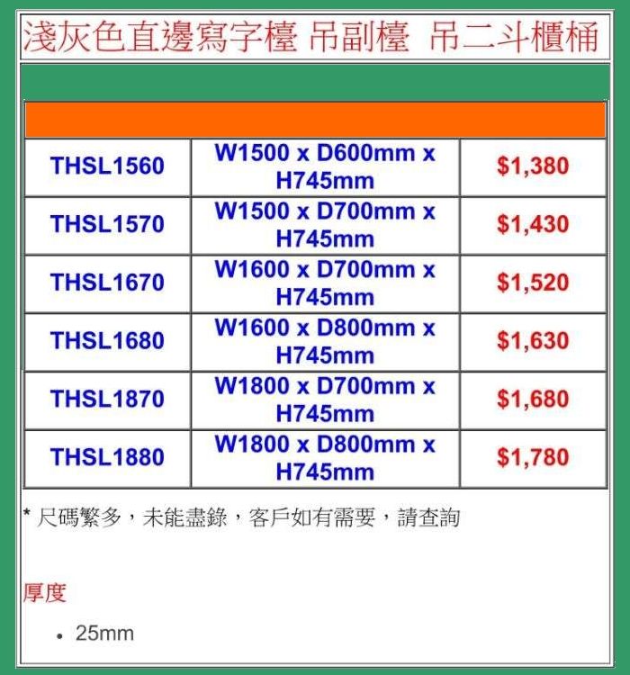 淺灰色直邊頂板寫字檯+二吊+三吊櫃桶 (內有價目表)
